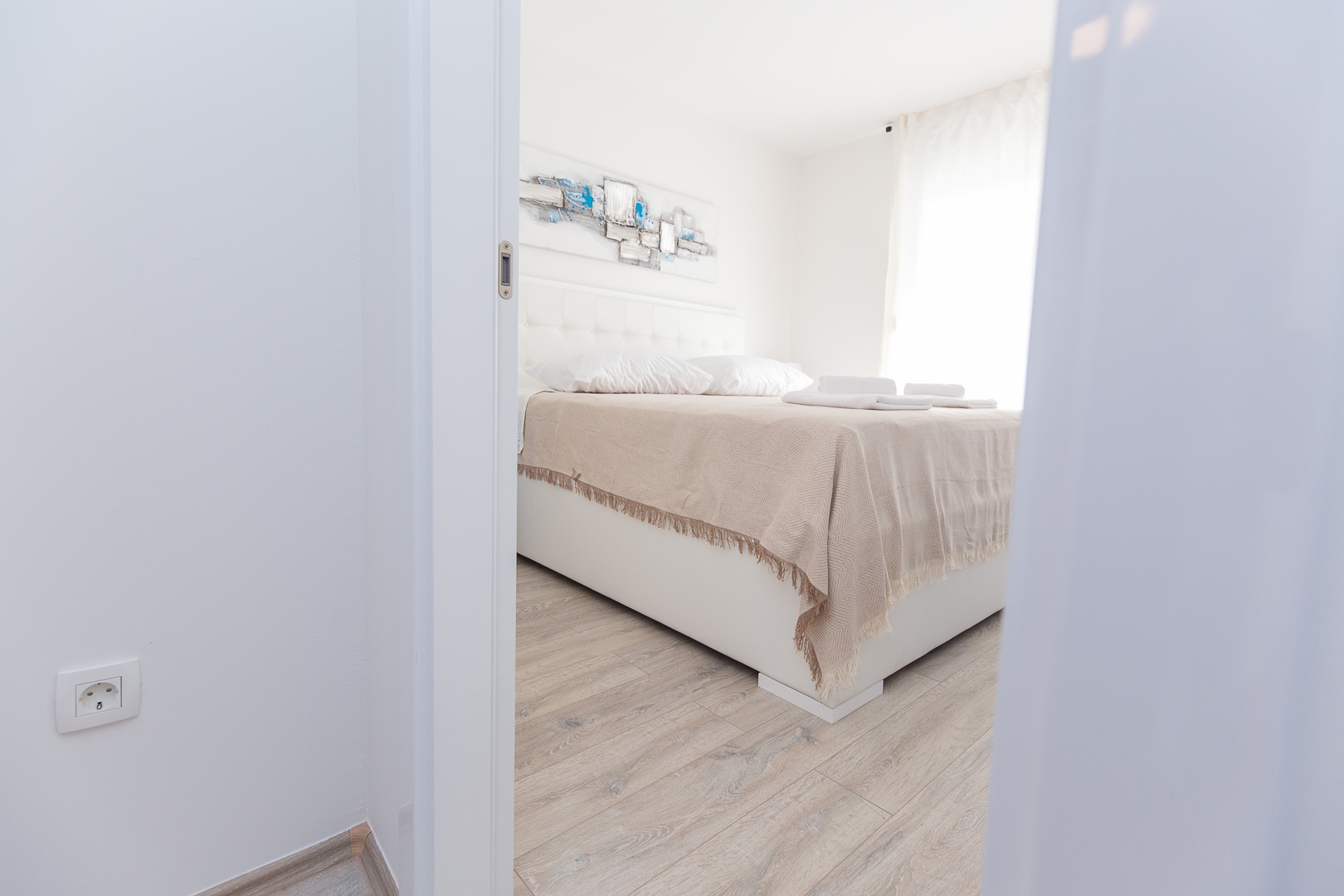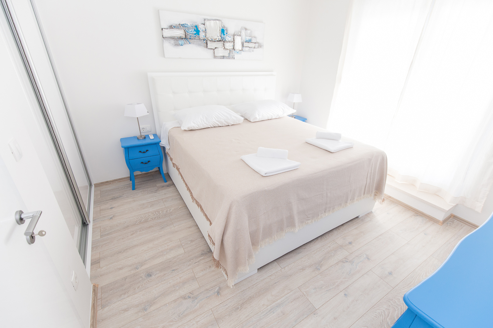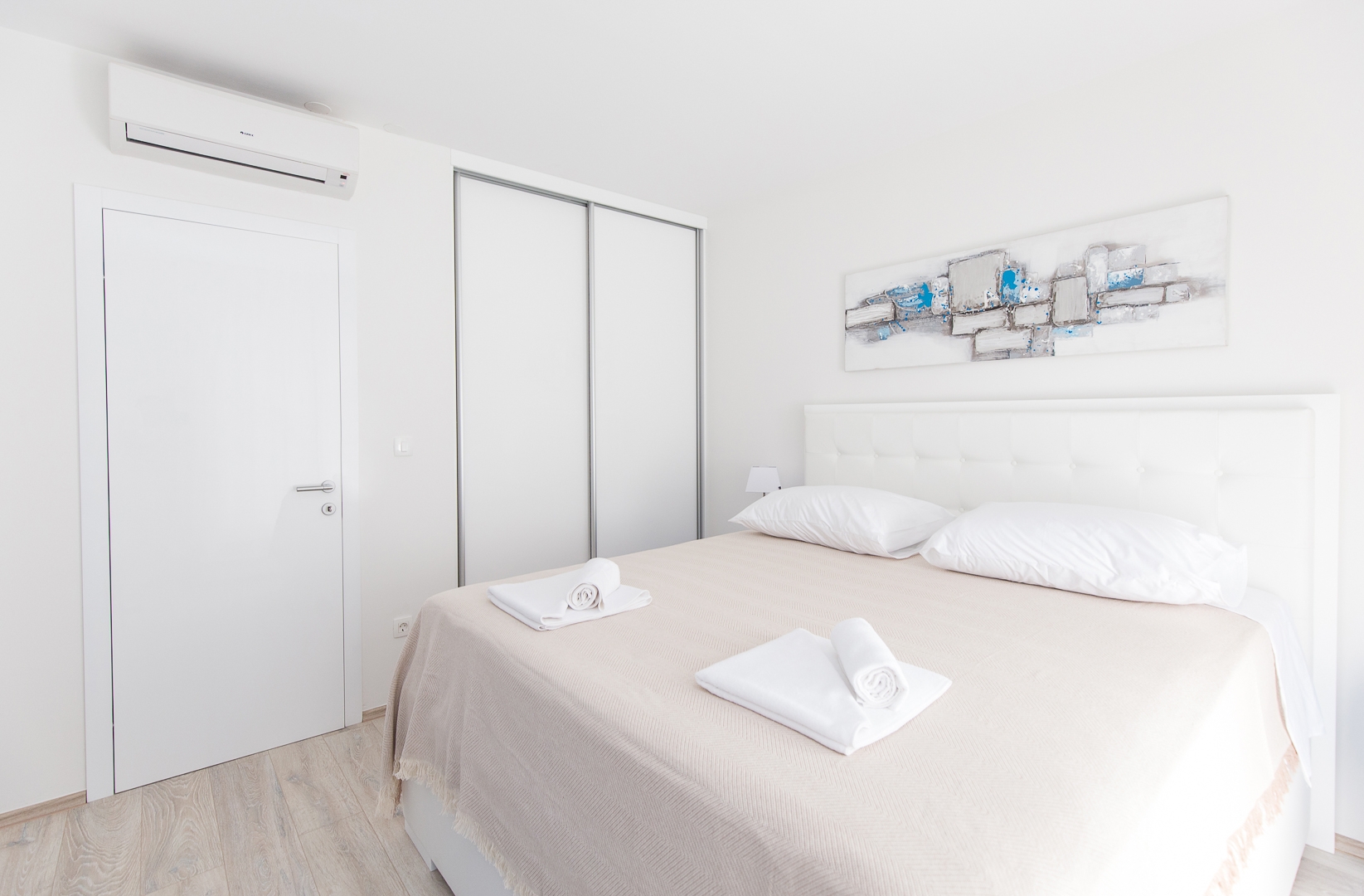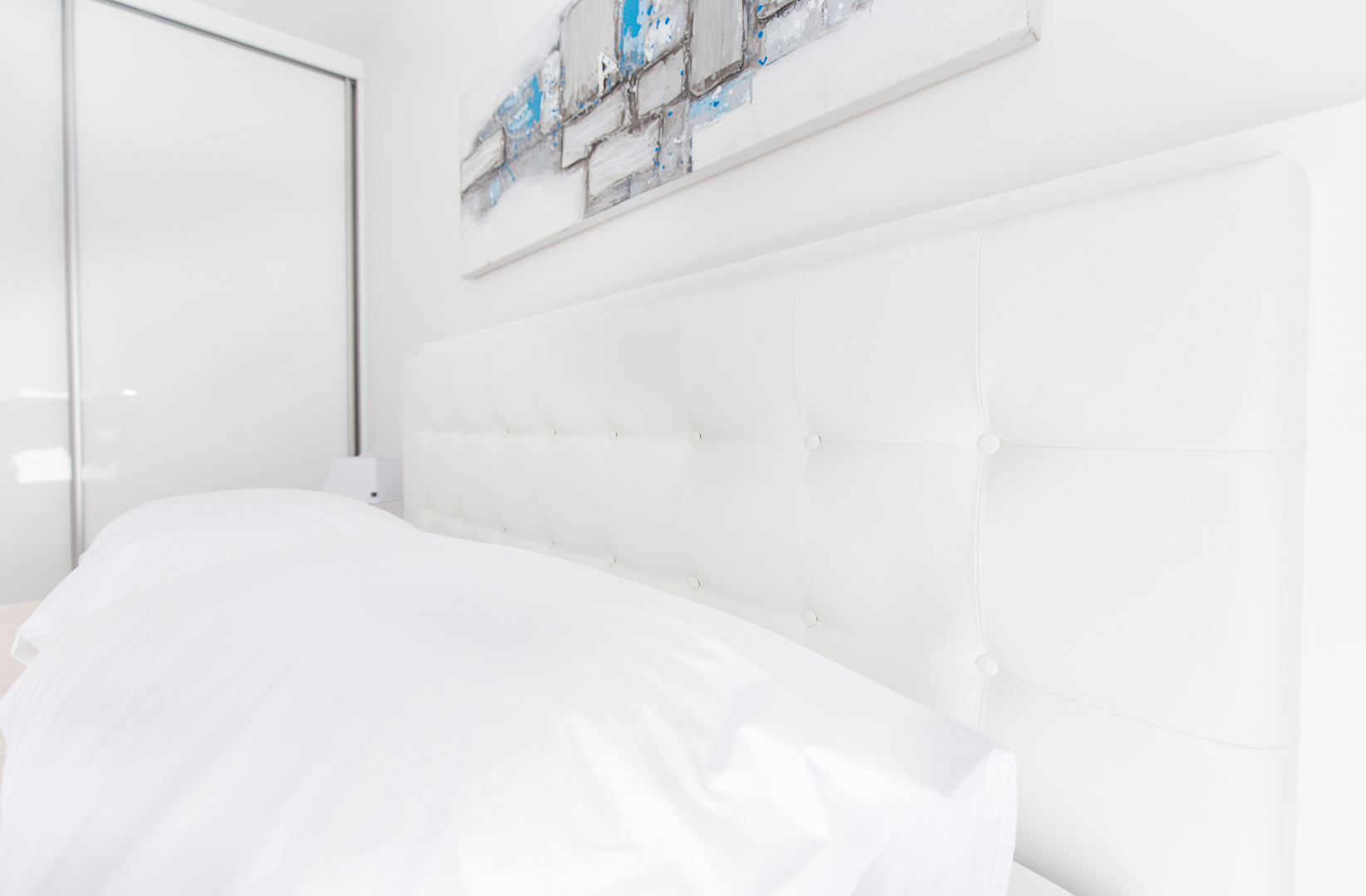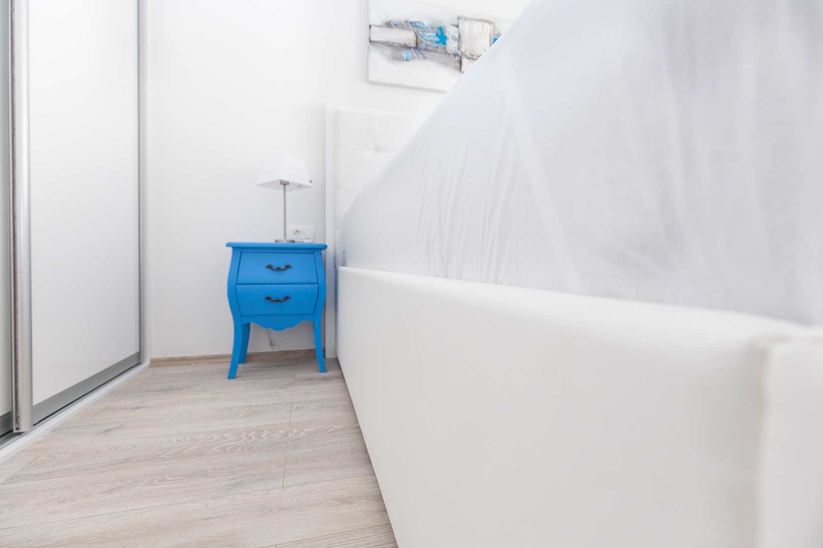 Stambeni prostor smješten u Splitu odiše čistoćom i prozračnošću zahvaljujući namještajima na mjeru kod kojih glavnu riječ vodi bijela boja i čiste linije. Modernizam u kombinaciji s efektnim detaljima plave karakteristične za Mediteranski stil stvara dojam sklada i harmonije. Sav namještaj rađen na mjeru prilagođen je idejama kupaca pri tom pazeći na zahtjeve prostora. U spavaćoj sobi centralni element je komforan krevet tapeciran u bijelo. Noćni ormarići koji se nastavljaju uz krevet i komoda oblih linija u pigmentiranoj plavoj boji izvrsna su protuteža ravnim bijelim elementima. Sobna vrata skrivenih britvela savršeno se uklapaju stvarajući osjećaj neprekidnosti. S obzirom na udaljenost od ormara do kreveta, klizna stjenka bila je odgovarajući odabir.