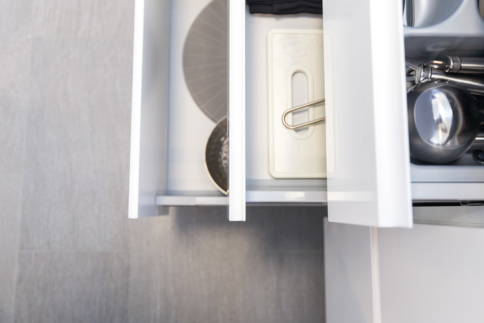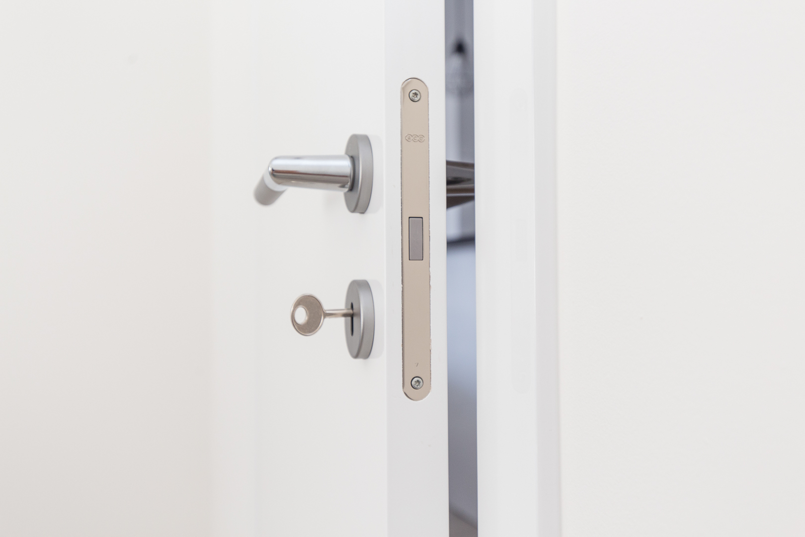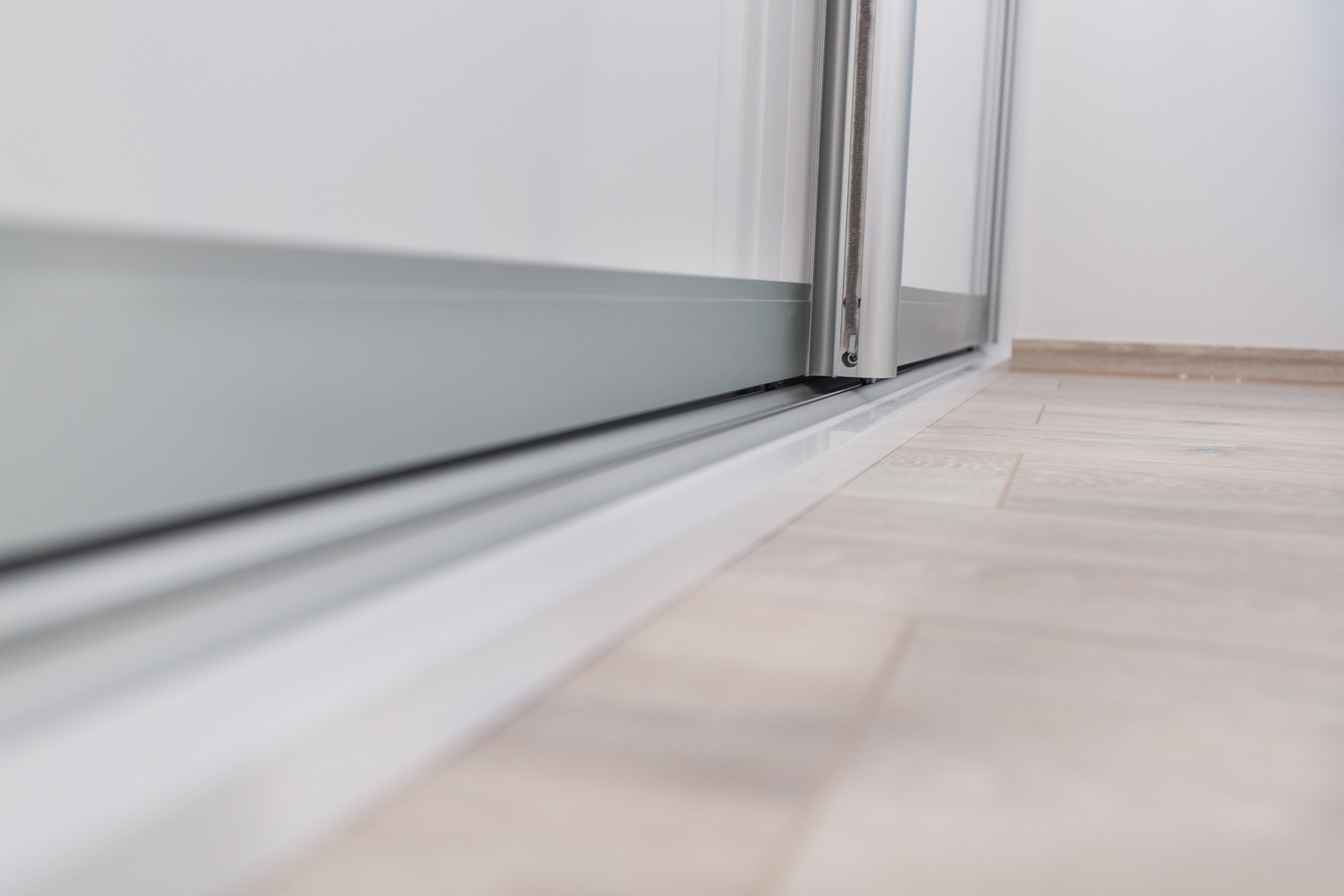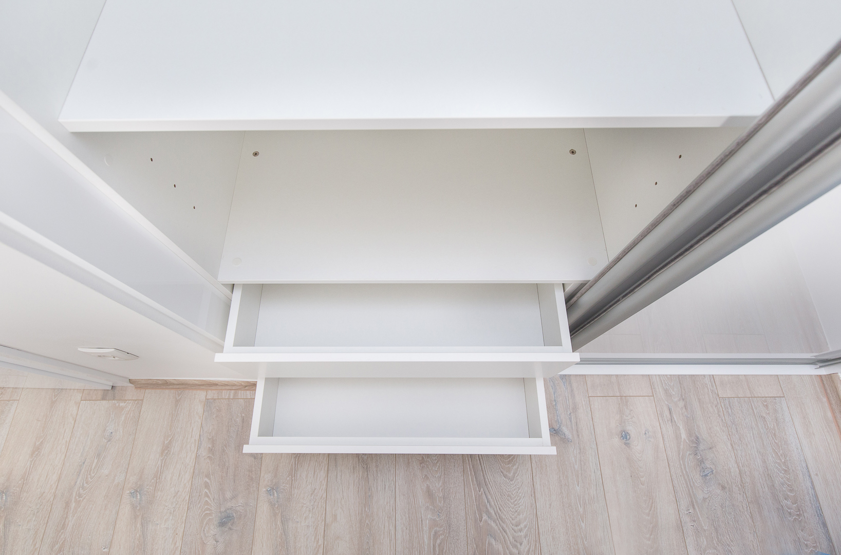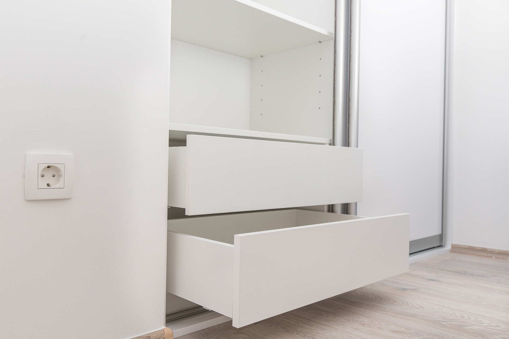 Stambeni prostor smješten u Splitu odiše čistoćom i prozračnošću zahvaljujući namještajima na mjeru kod kojih glavnu riječ vodi bijela boja i čiste linije. Modernizam u kombinaciji s efektnim detaljima plave karakteristične za Mediteranski stil stvara dojam sklada i harmonije. Sav namještaj rađen na mjeru prilagođen je idejama kupaca pri tom pazeći na zahtjeve prostora. U spavaćoj sobi centralni element je komforan krevet tapeciran u bijelo. Noćni ormarići koji se nastavljaju uz krevet i komoda oblih linija u pigmentiranoj plavoj boji izvrsna su protuteža ravnim bijelim elementima. Sobna vrata skrivenih britvela savršeno se uklapaju stvarajući osjećaj neprekidnosti. S obzirom na udaljenost od ormara do kreveta, klizna stjenka bila je odgovarajući odabir.