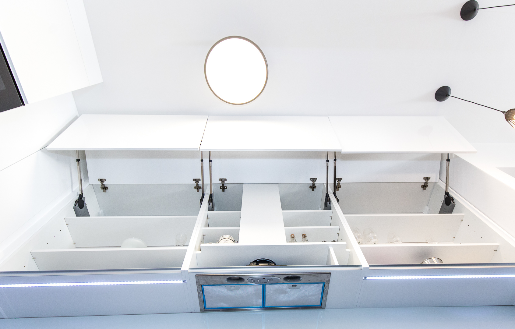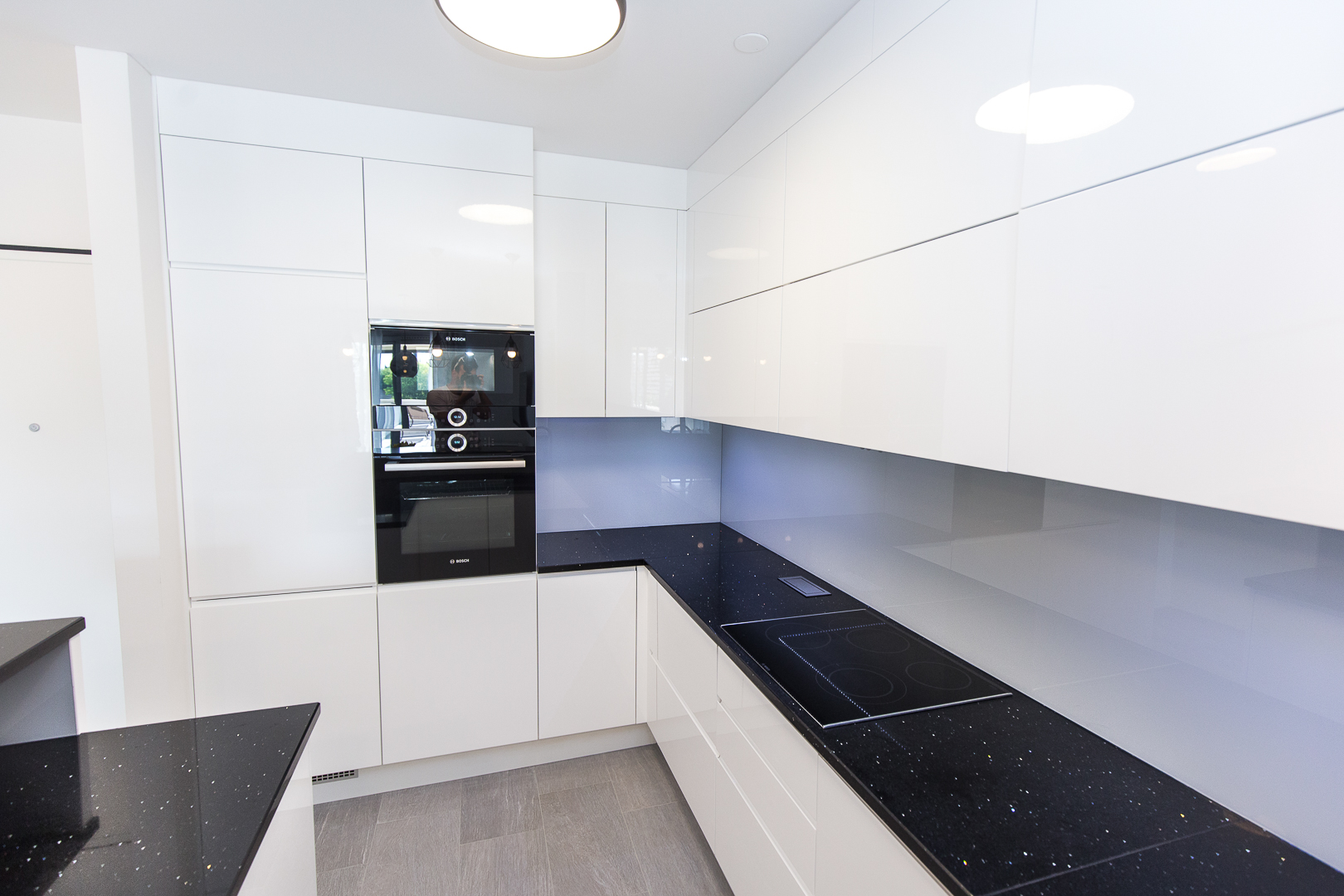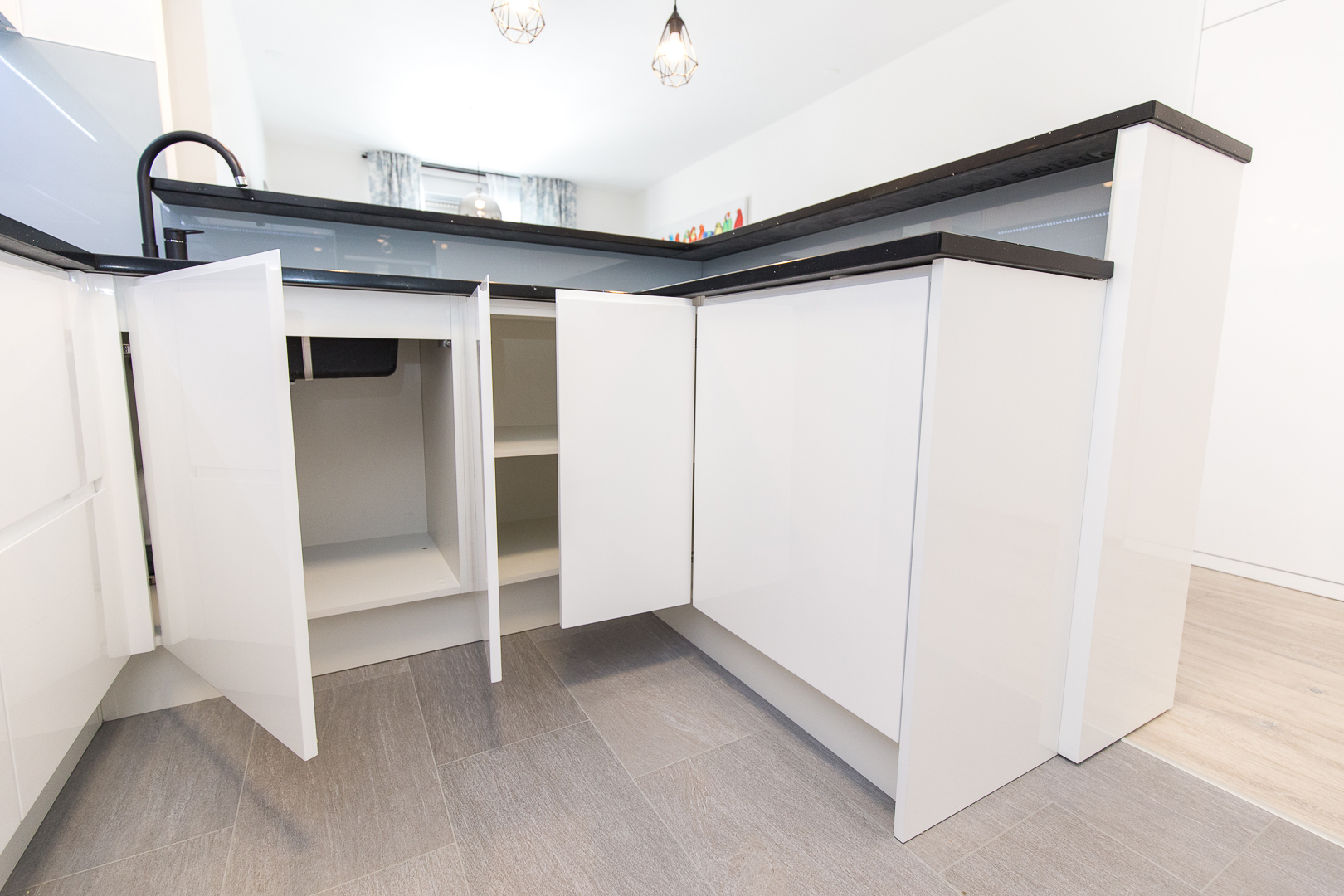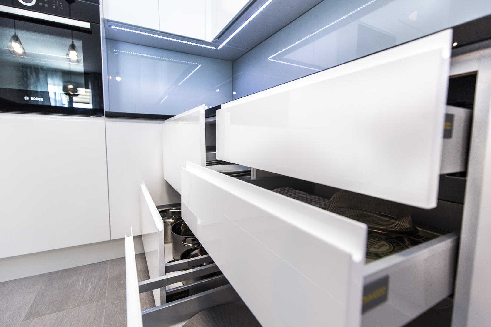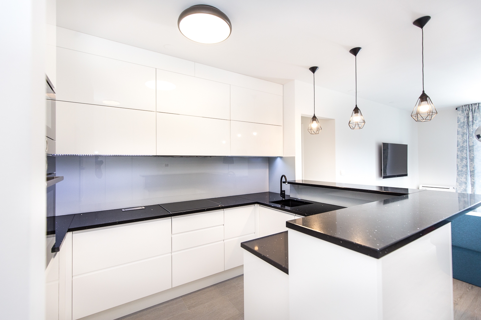 Istim načelima estetike vodili smo se i pri dizajniranju prostrane kuhinje na mjeru. Visoki sjaj bijelih fronti s kontrastnim tamnim kuhinjskim elementima i svjetlucavom tamnom radnom plohom ove kuhinje čine jedinstven dizajn. Osim estetskih komponenti, karakteristike namještaja na mjeru ovog doma su i praktičnost i vrhunska izvedba. Kuhinja je obogaćena raznim mehanizmima, primjerice ladice sadržavaju soft-stop i kvalitetne vodilice, zatim ublaživači udara na vratnicama te pneumatske kipe na godnjim elementima. Njenu ljepotu dodatno naglašava mliječno staklo, a „something blue“ komponenta odražava se u plavičastoj led rasvjeti.