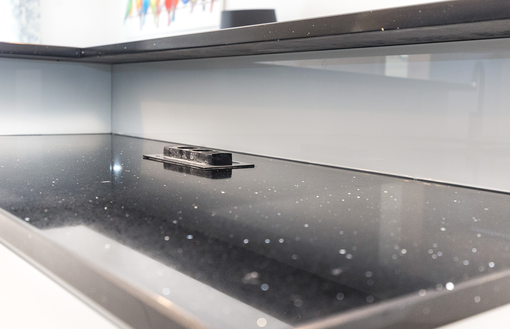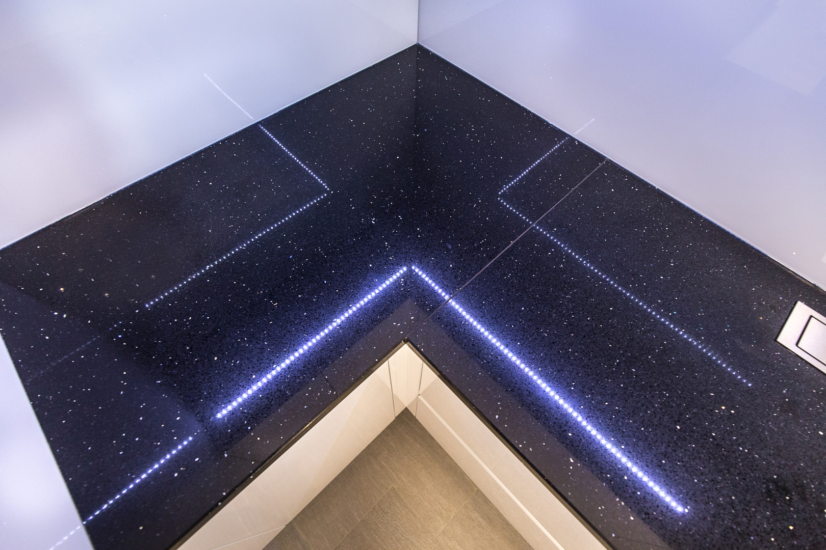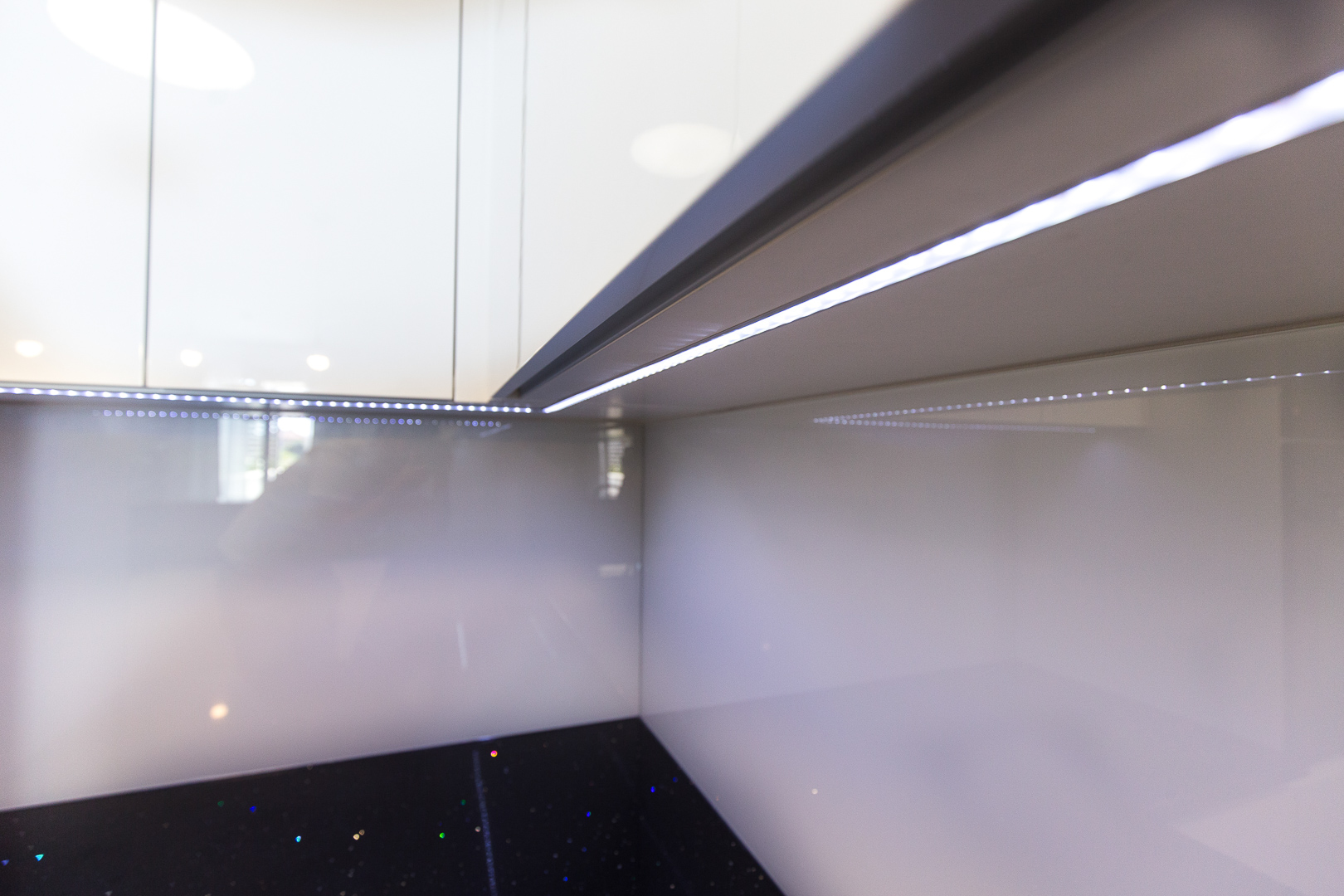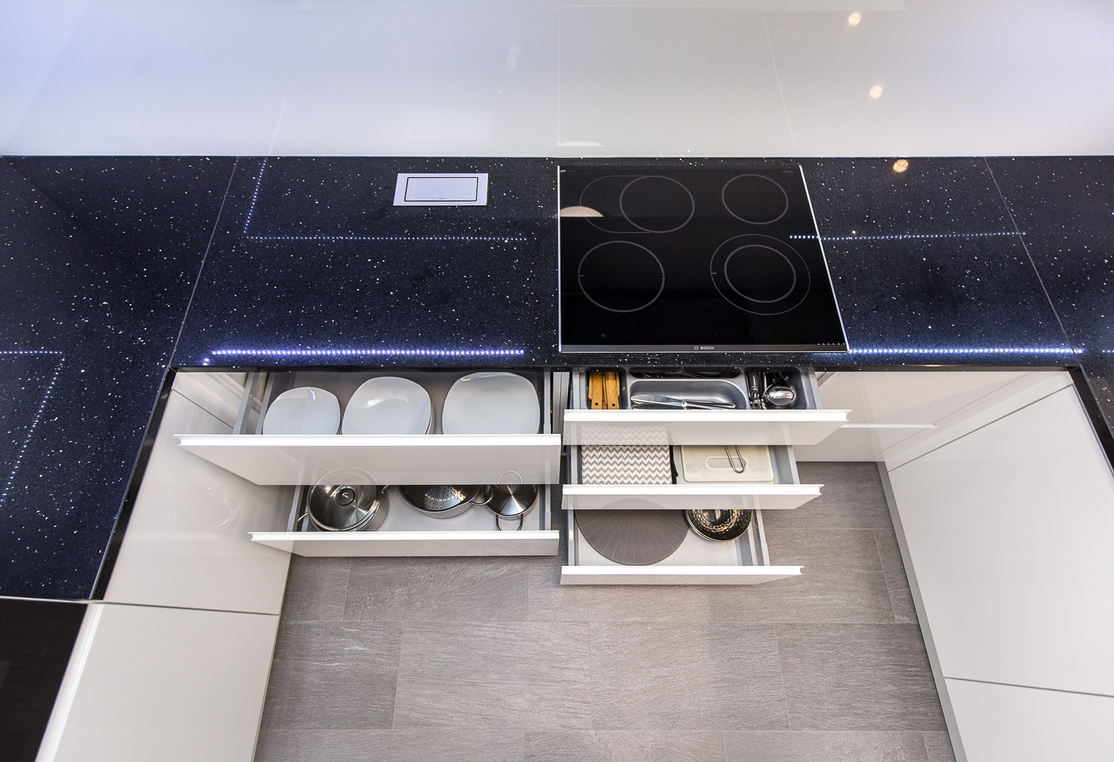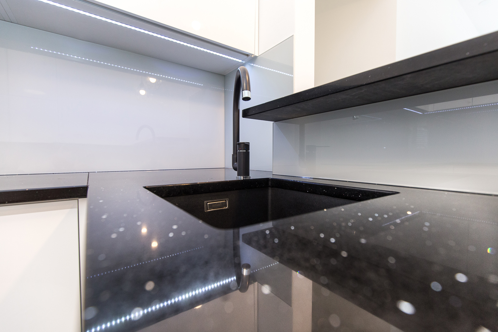 Istim načelima estetike vodili smo se i pri dizajniranju prostrane kuhinje na mjeru. Visoki sjaj bijelih fronti s kontrastnim tamnim kuhinjskim elementima i svjetlucavom tamnom radnom plohom ove kuhinje čine jedinstven dizajn. Osim estetskih komponenti, karakteristike namještaja na mjeru ovog doma su i praktičnost i vrhunska izvedba. Kuhinja je obogaćena raznim mehanizmima, primjerice ladice sadržavaju soft-stop i kvalitetne vodilice, zatim ublaživači udara na vratnicama te pneumatske kipe na godnjim elementima. Njenu ljepotu dodatno naglašava mliječno staklo, a „something blue“ komponenta odražava se u plavičastoj led rasvjeti.