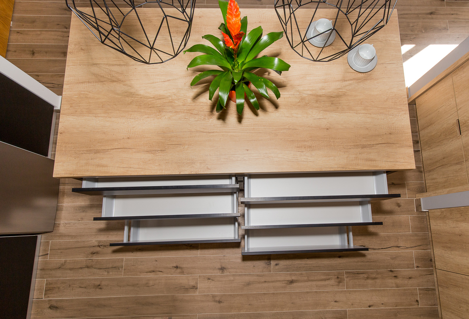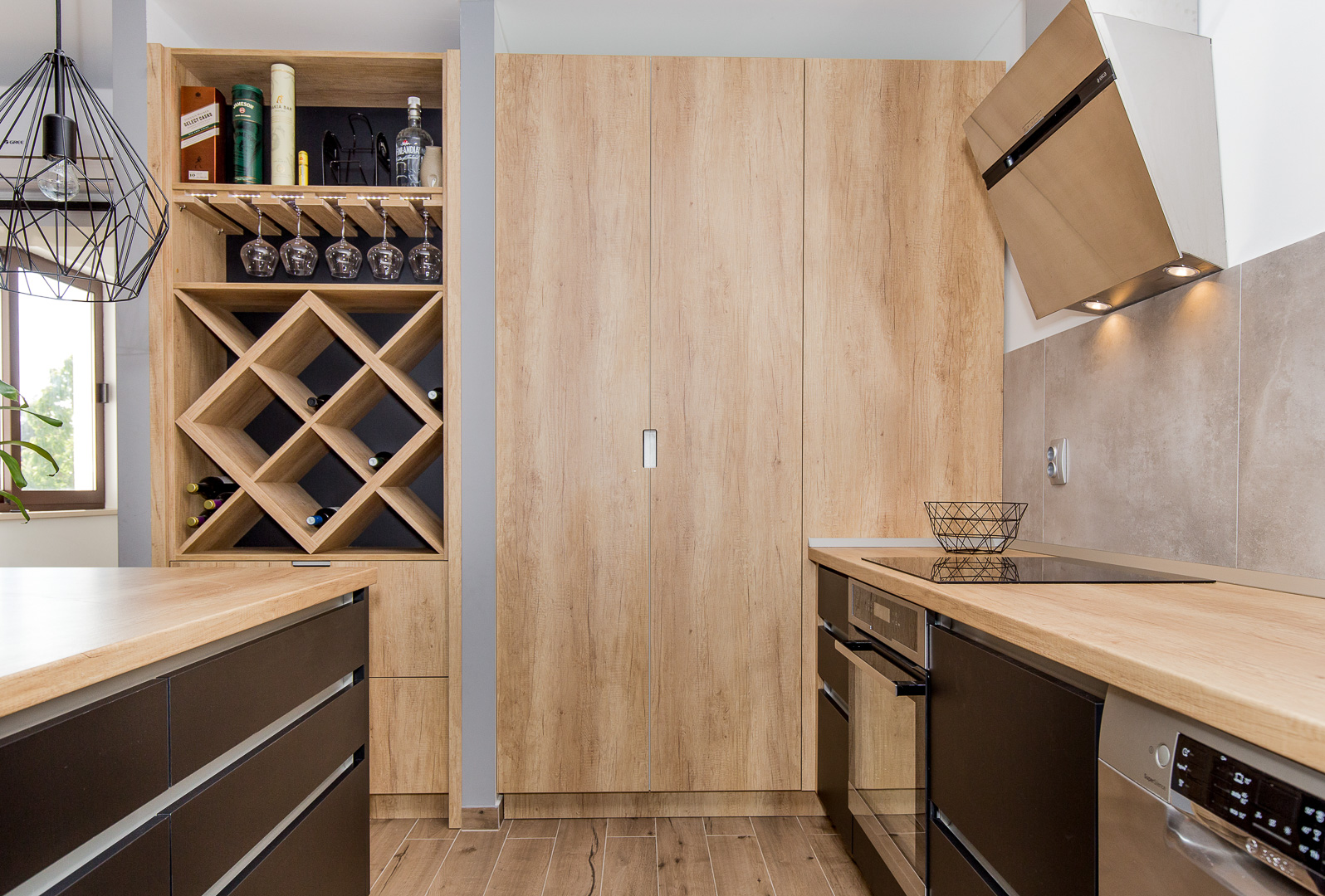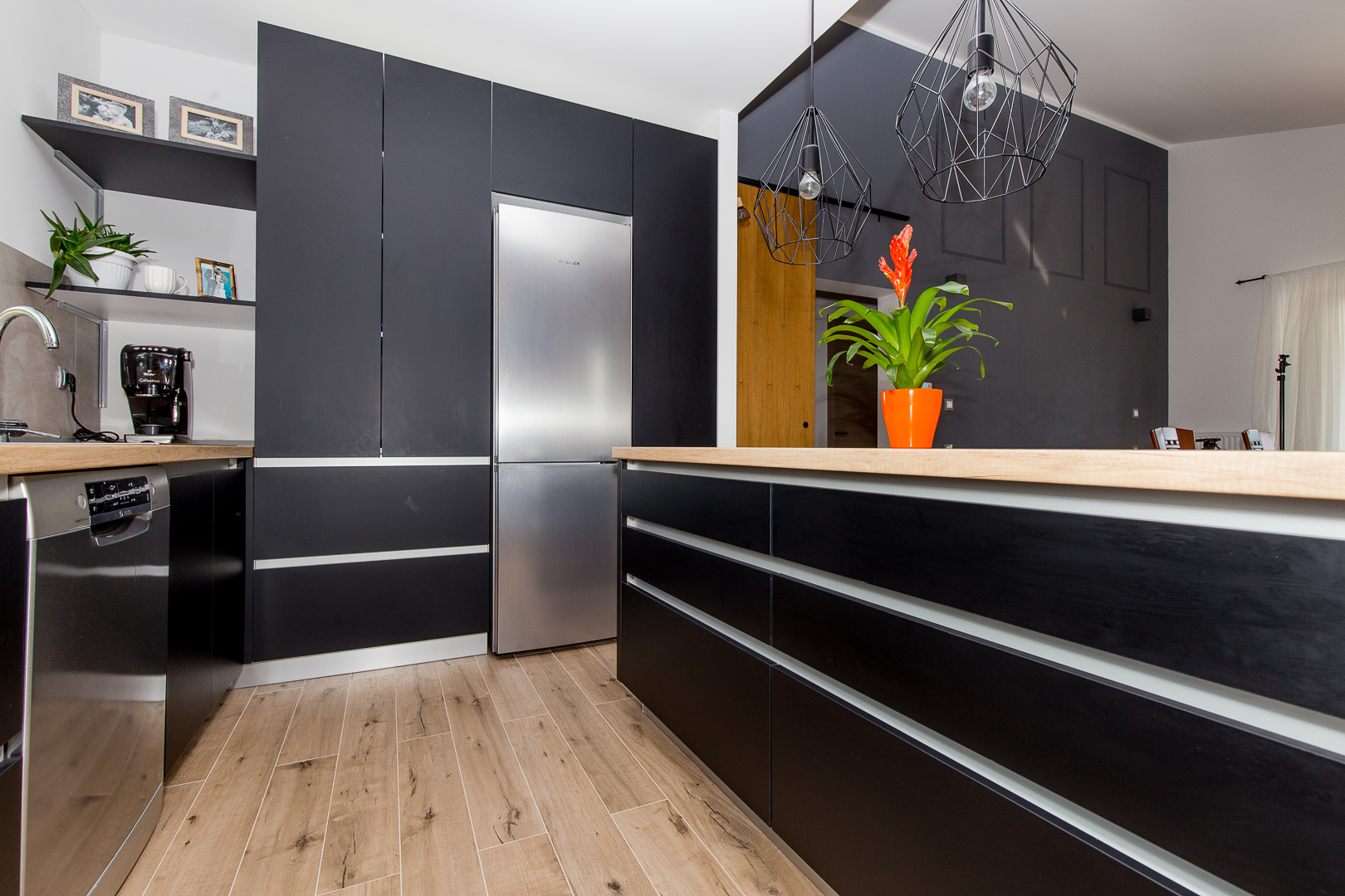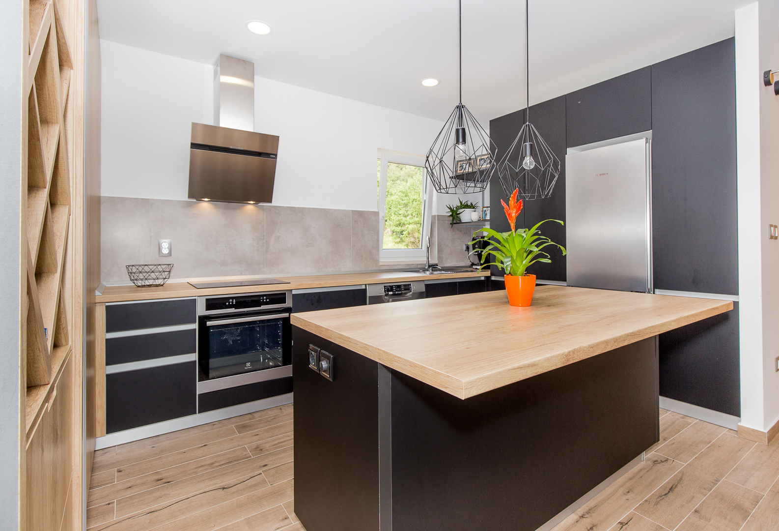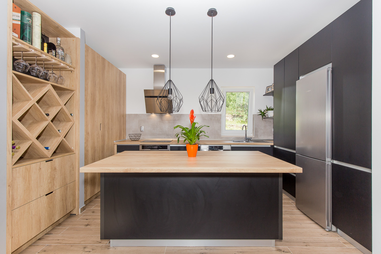 Tamni kuhinjski elementi u kombinaciji s drvnim dekorom stvaraju dojmljiv efekt, a kuhinjski uređaji, sokl i profilne ručke – sve u inox boji, dokaz su da kuhinja kombinirana u tri različita dekora itekako može biti uspješan spoj. Osim izgleda, ono što zasigurno izdvaja ovu kuhinju njena je prostranost. Obiluje elementima za pohranu, radne plohe ima sasvim dovoljno, a element vinoteke pridonosi šarmu ove kuhinje. I pri prvom pogledu lako je zamisliti vesela noćna druženja uz kuhinjski otok.