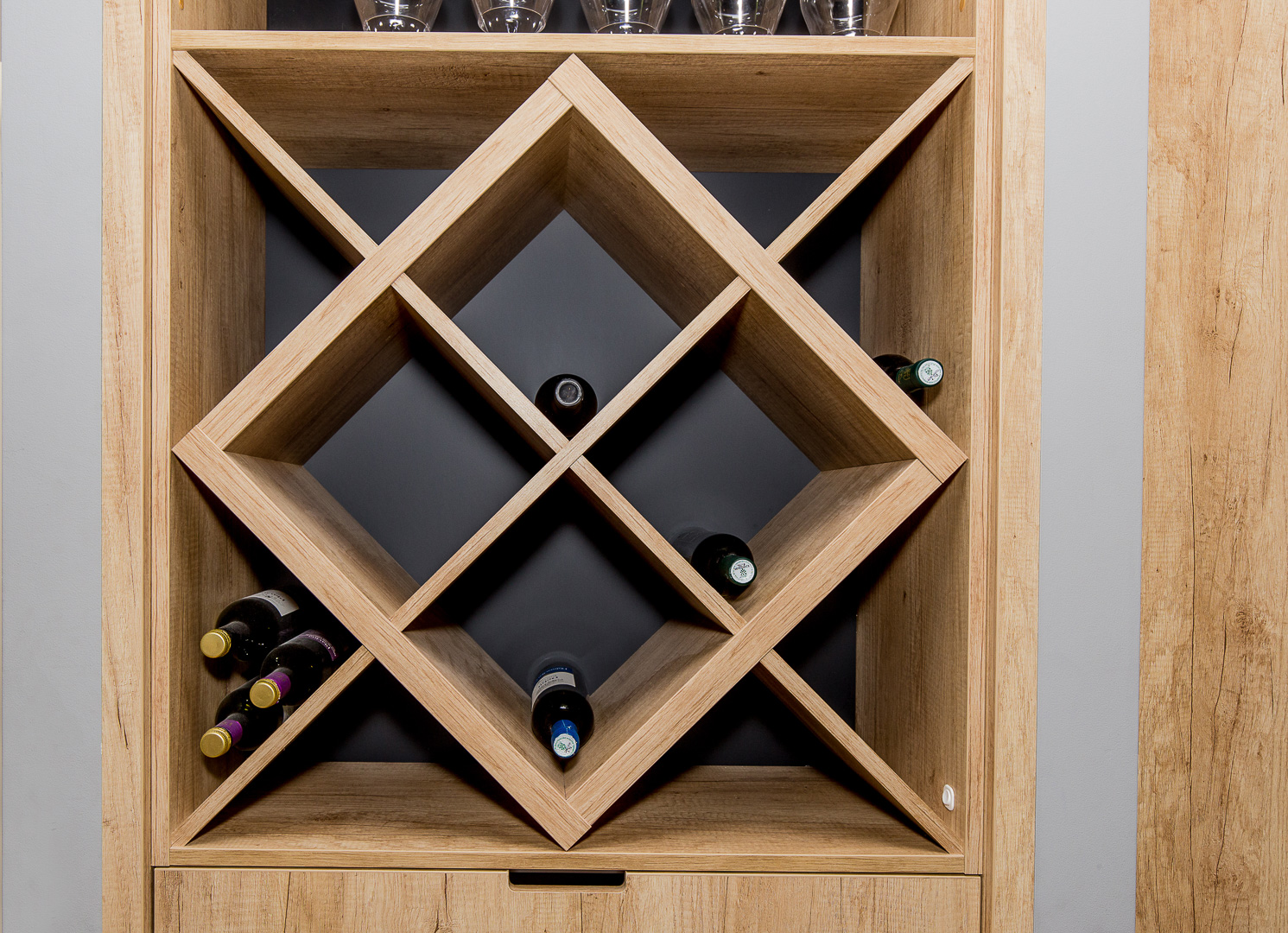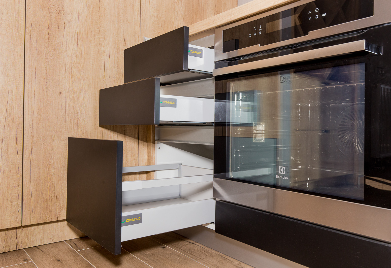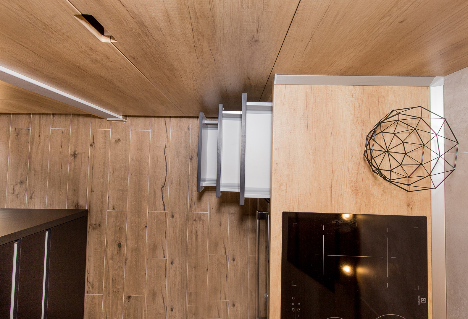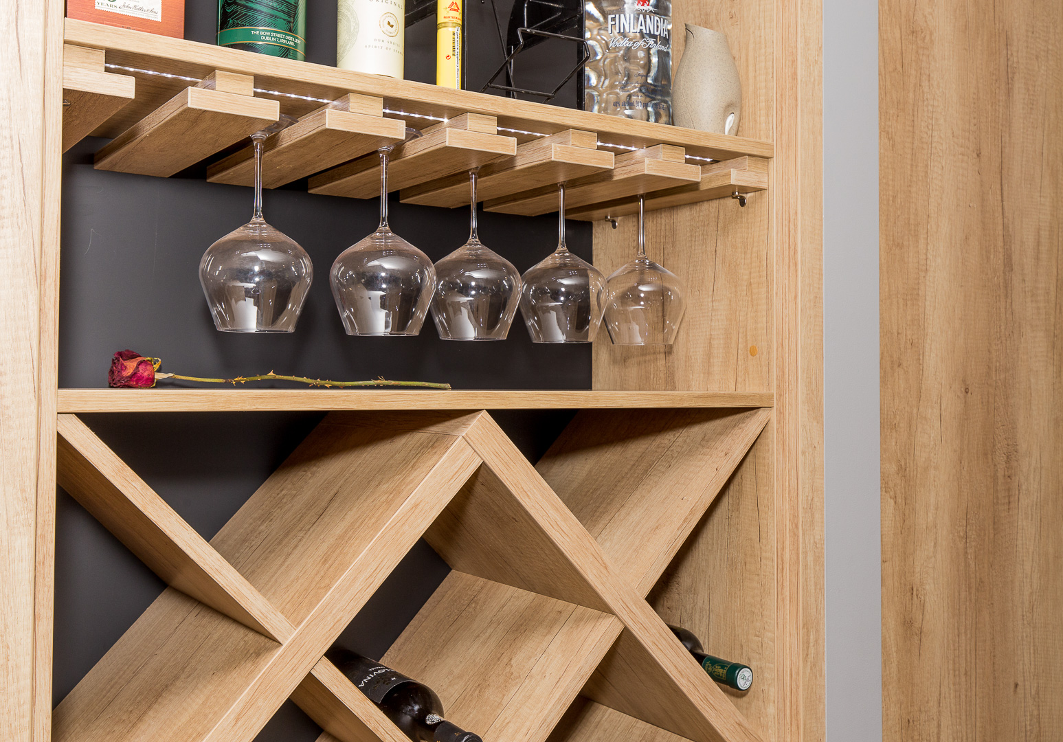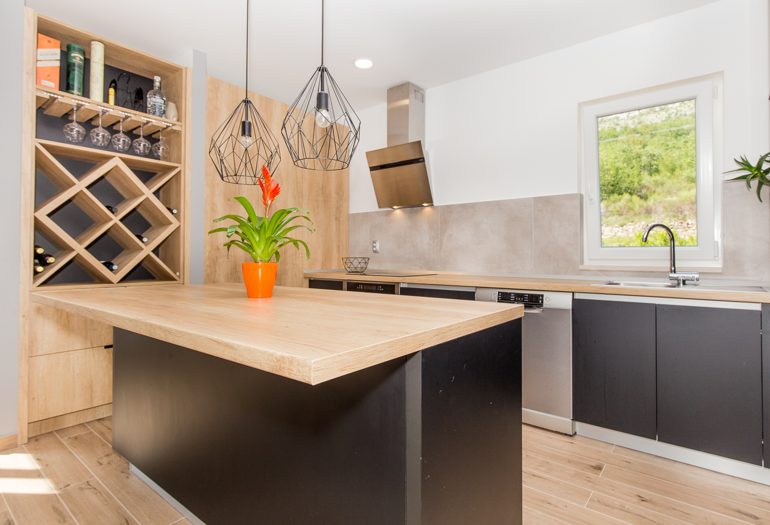 Tamni kuhinjski elementi u kombinaciji s drvnim dekorom stvaraju dojmljiv efekt, a kuhinjski uređaji, sokl i profilne ručke – sve u inox boji, dokaz su da kuhinja kombinirana u tri različita dekora itekako može biti uspješan spoj. Osim izgleda, ono što zasigurno izdvaja ovu kuhinju njena je prostranost. Obiluje elementima za pohranu, radne plohe ima sasvim dovoljno, a element vinoteke pridonosi šarmu ove kuhinje. I pri prvom pogledu lako je zamisliti vesela noćna druženja uz kuhinjski otok.