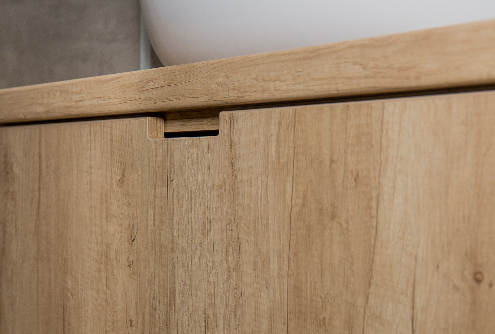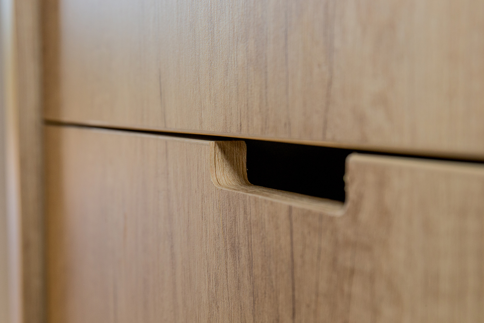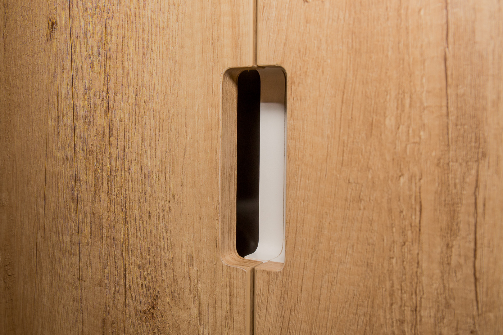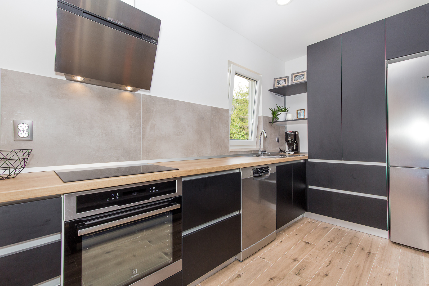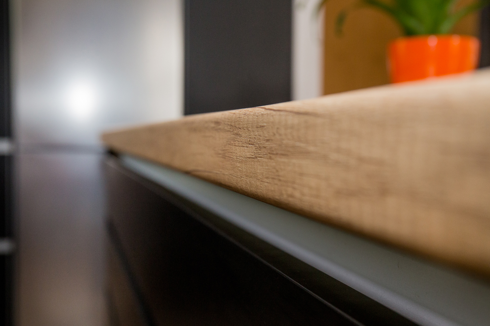 Tamni kuhinjski elementi u kombinaciji s drvnim dekorom stvaraju dojmljiv efekt, a kuhinjski uređaji, sokl i profilne ručke – sve u inox boji, dokaz su da kuhinja kombinirana u tri različita dekora itekako može biti uspješan spoj. Osim izgleda, ono što zasigurno izdvaja ovu kuhinju njena je prostranost. Obiluje elementima za pohranu, radne plohe ima sasvim dovoljno, a element vinoteke pridonosi šarmu ove kuhinje. I pri prvom pogledu lako je zamisliti vesela noćna druženja uz kuhinjski otok.
