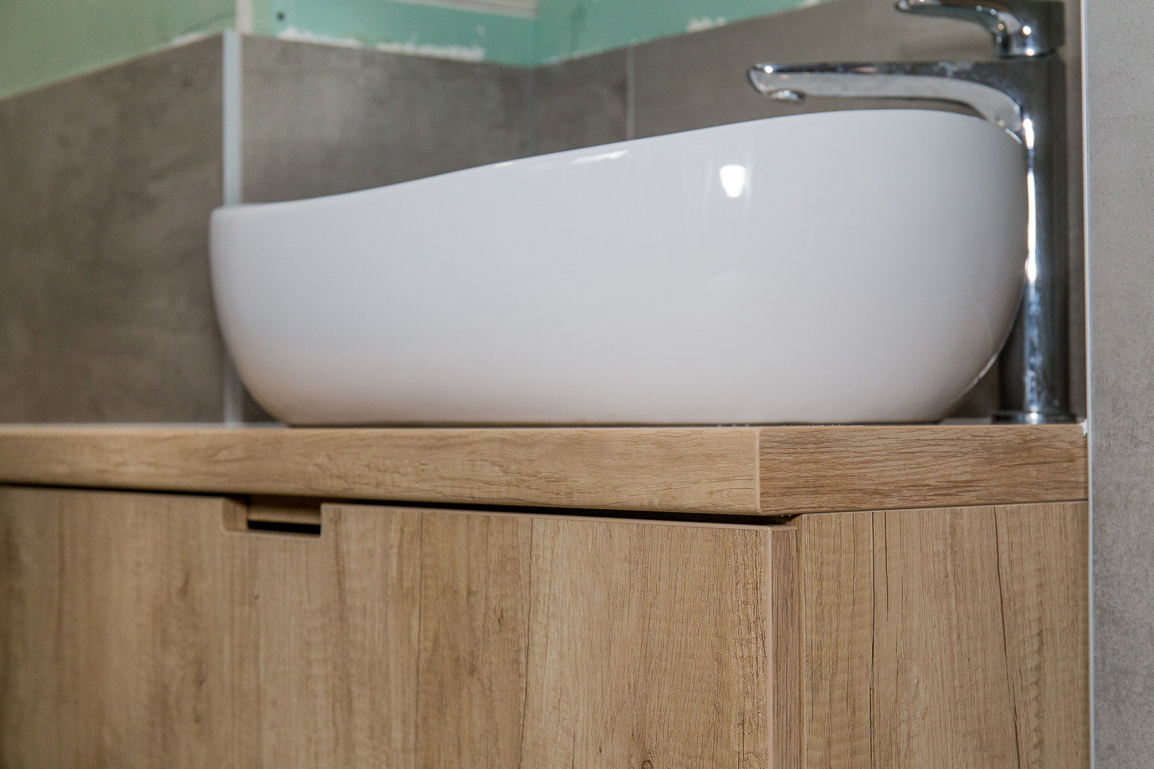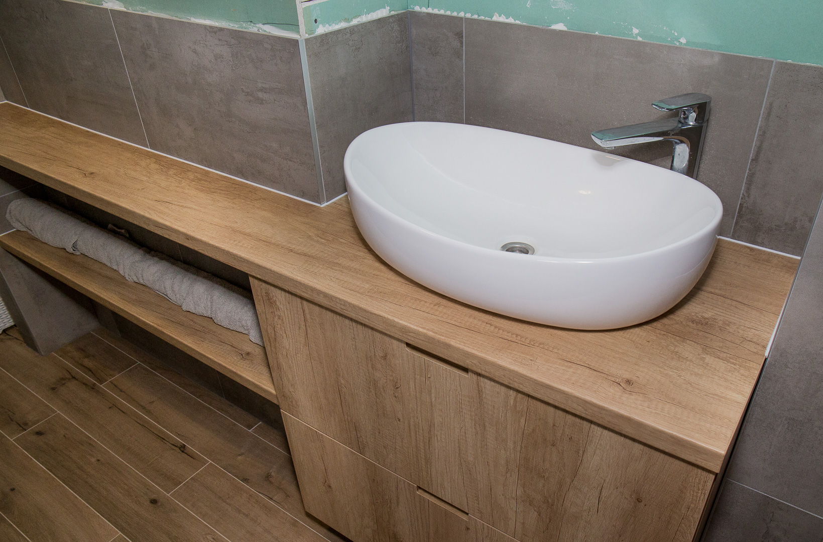Kuhinjski elementi, kao i elementi u kupaonici prilagođavani su postojećim pregradnim zidovima.