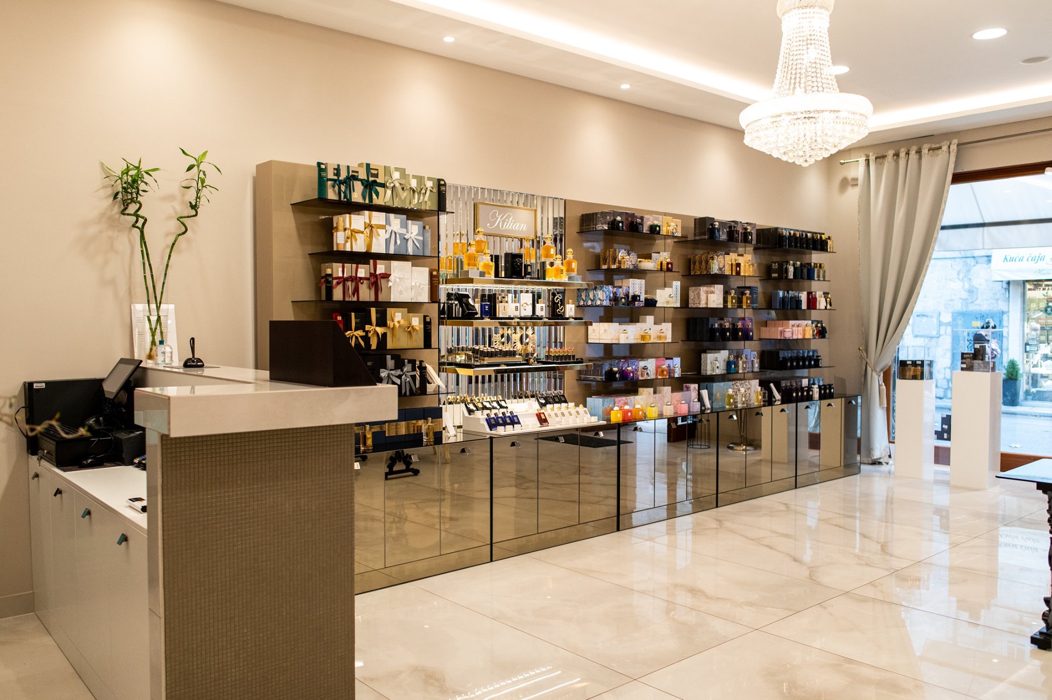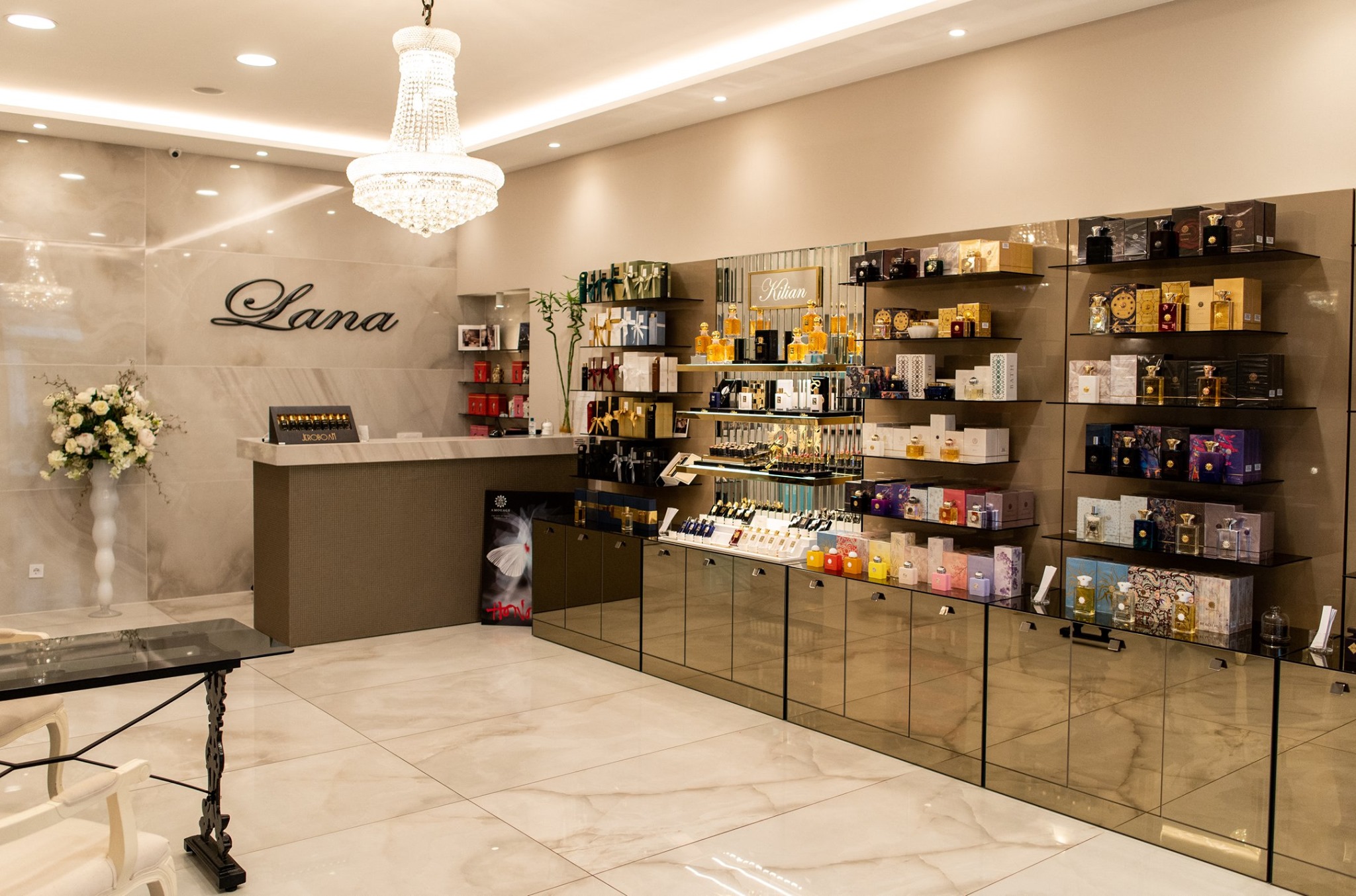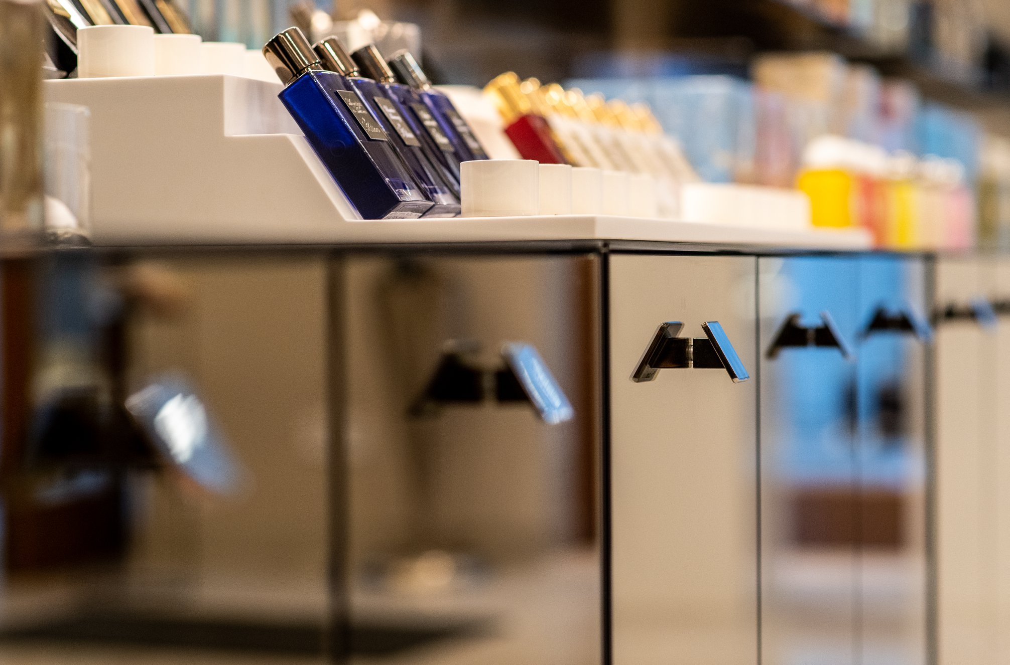 Blještav izgled i dojam profinjenosti i elegancije, baš kako bi jedna parfumerija i trebala izgledati, postignut je izradom namještaja na mjeru gdje je glavnu riječ vodilo staklo. Vodeći se nacrtima dizajnerice, fronte i strop od ormarića oslonjenih na pod izradili smo od tamnog stakla s decentnim elegantnim ručkicama na frontama.