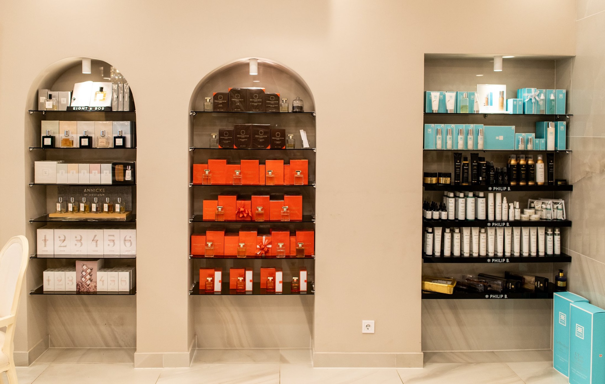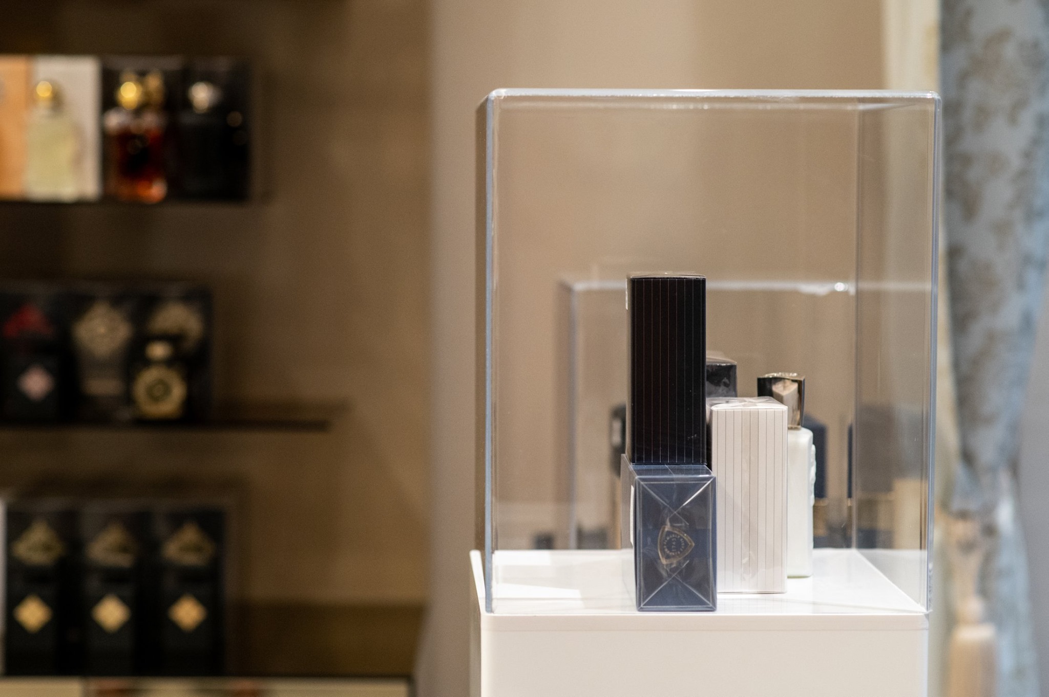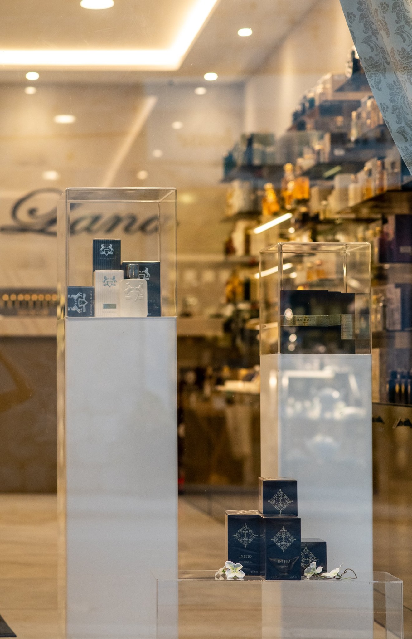 Blještav izgled i dojam profinjenosti i elegancije, baš kako bi jedna parfumerija i trebala izgledati, postignut je izradom namještaja na mjeru gdje je glavnu riječ vodilo staklo. Vodeći se nacrtima dizajnerice, fronte i strop od ormarića oslonjenih na pod izradili smo od tamnog stakla s decentnim elegantnim ručkicama na frontama.