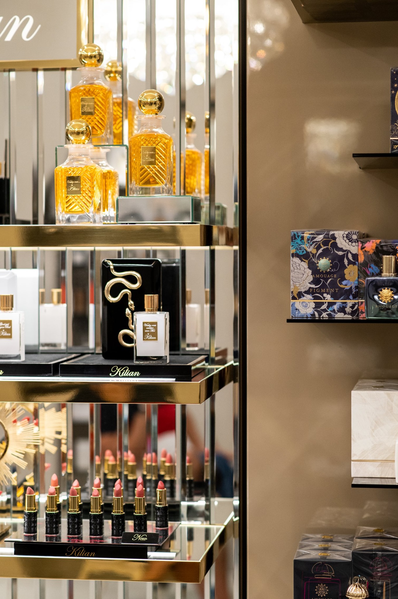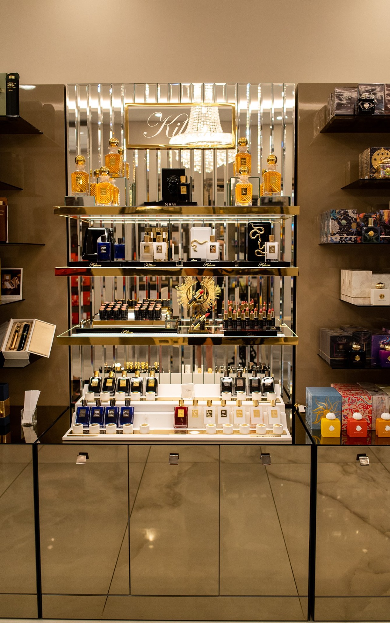 Iznad ormarića postavljeno je mnoštvo staklenih polica od kojih je dio izrađivan iz više komponenti kako bi se dobila dubina police i kako bi se u nju mogla ugraditi rasvjeta. Ona je također doprinijela efektu blještavila. Obrubi police izvedeni su u zlatnoj boji kako bi još više naglasili estetski izgled.