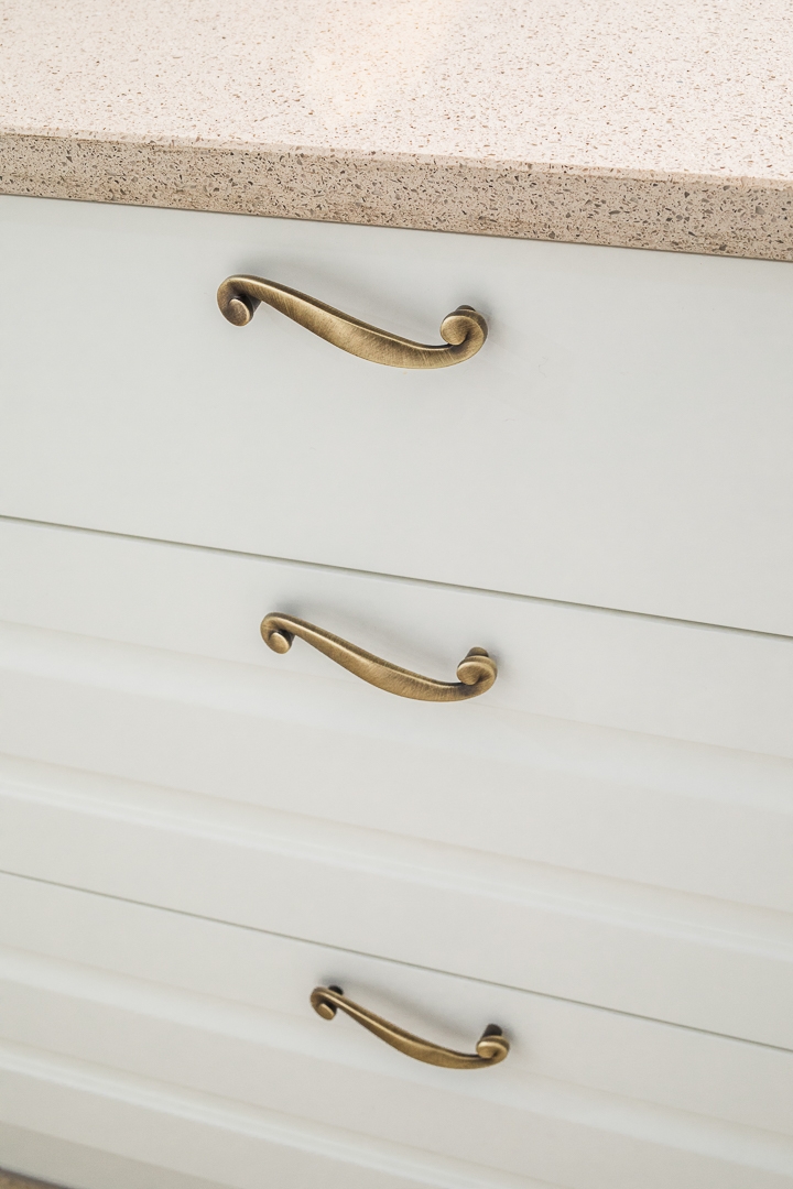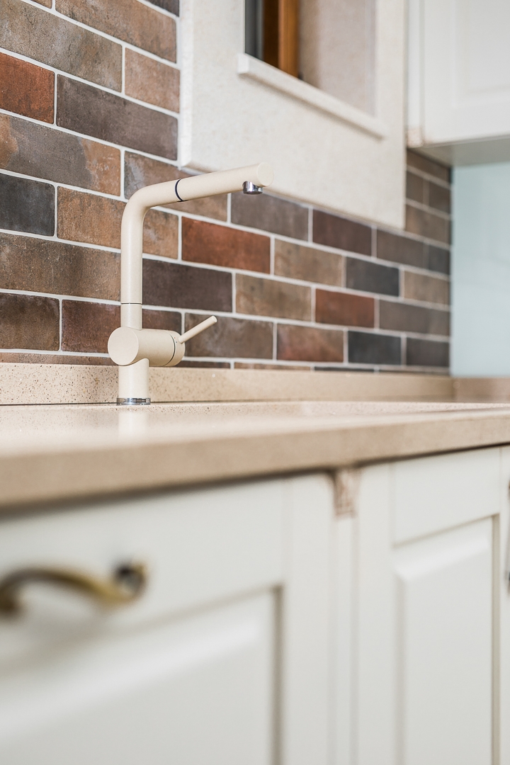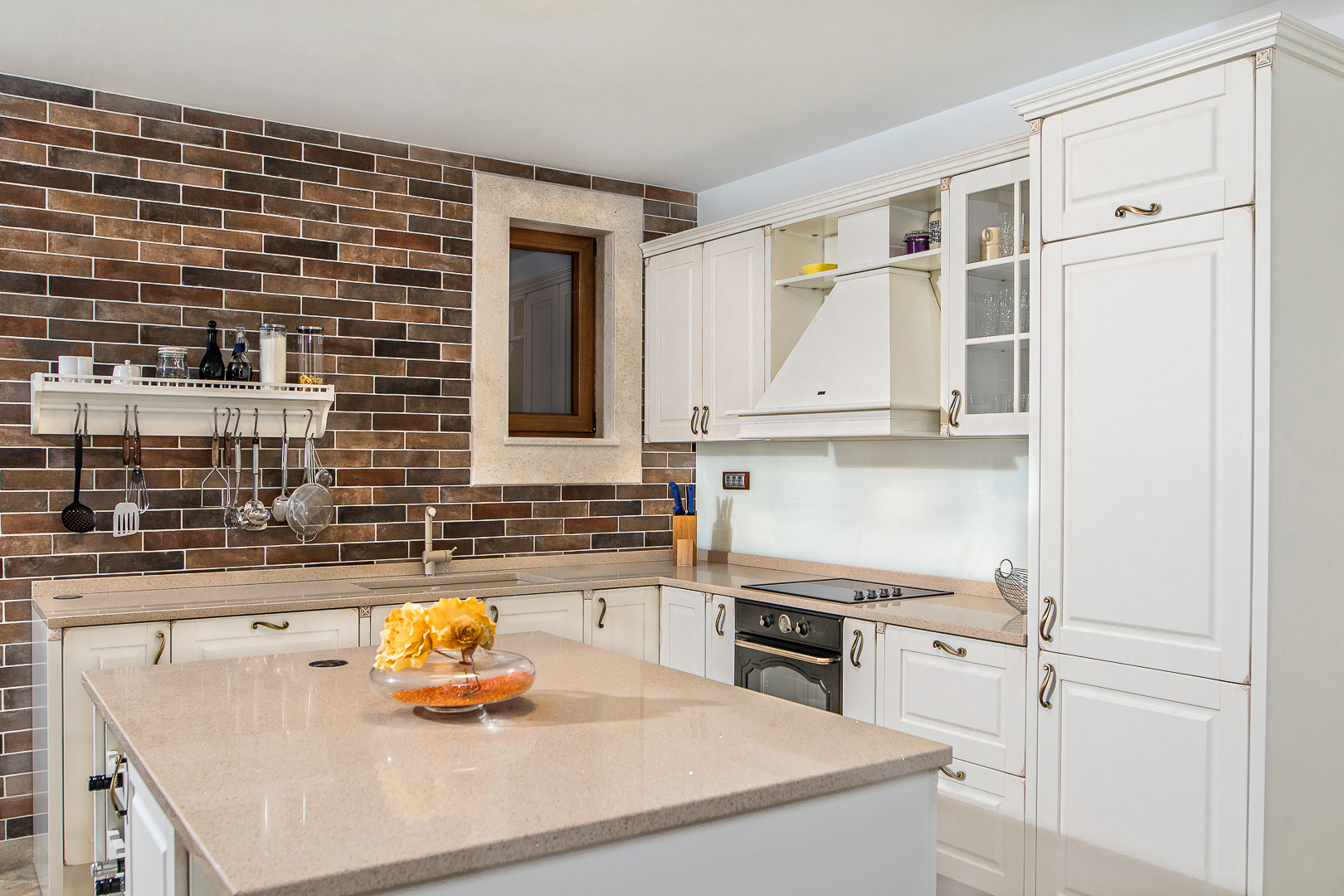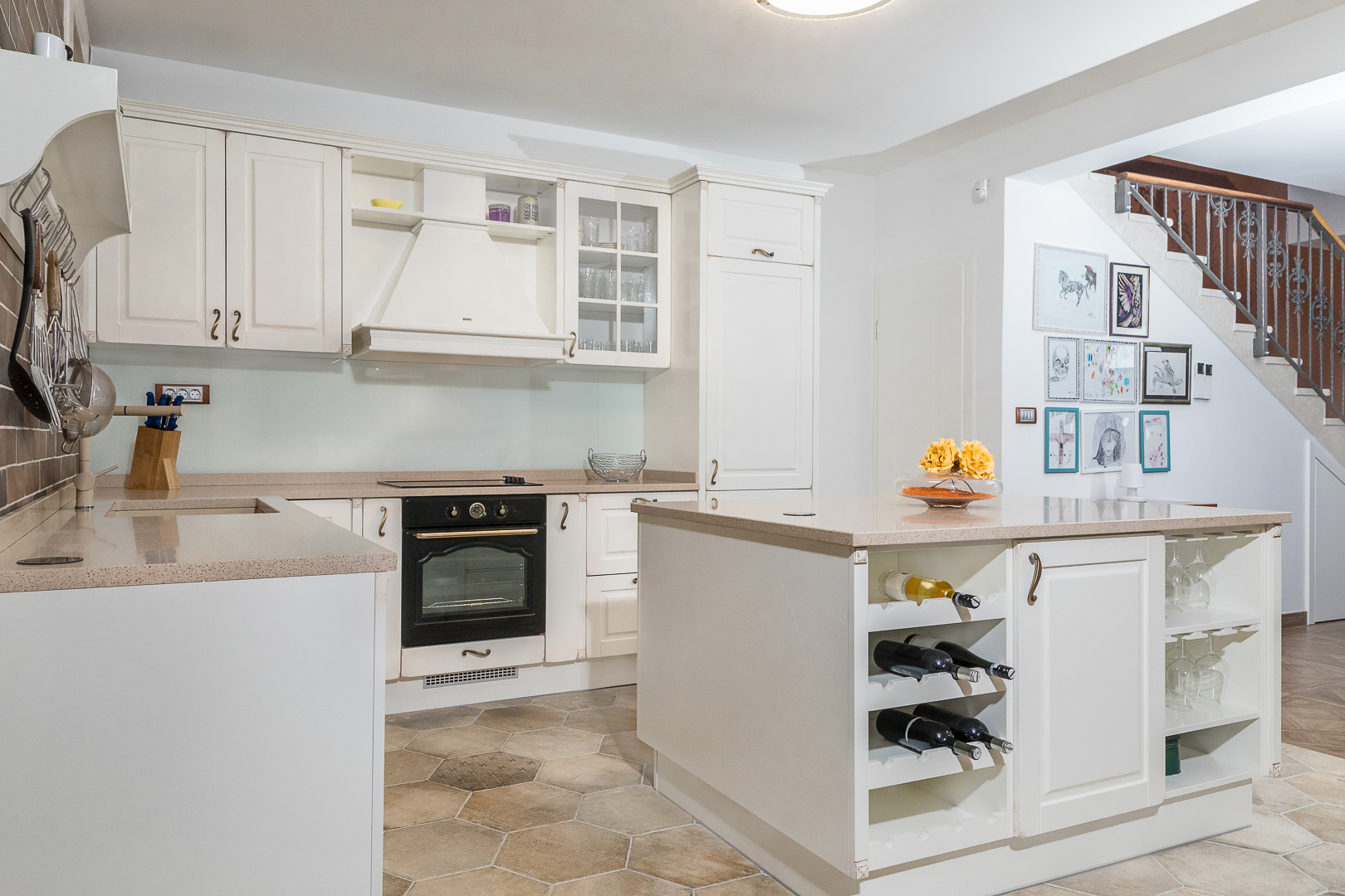 Bezvremenska ljepota ove kuhinje u rustičnom stilu postignuta je prepoznatljivim ukladama na masiv frontama. Specifičnost izvedbe kod ove kuhinje su zakošeni tzv. smušani rubovi kojima je decentno dodana patina kako bi se postigao vintage izgled. U istom stilu birani su i kuhinjski aparati te ostala dodatna oprema i detalji. Kuhinja je obogaćena dodavanjem dekorativnih masivnih bokova te oblaganjem samostojeće nape, a ukrasne masiv krune na gornjim elementima i kamena radna ploha točka su na i.