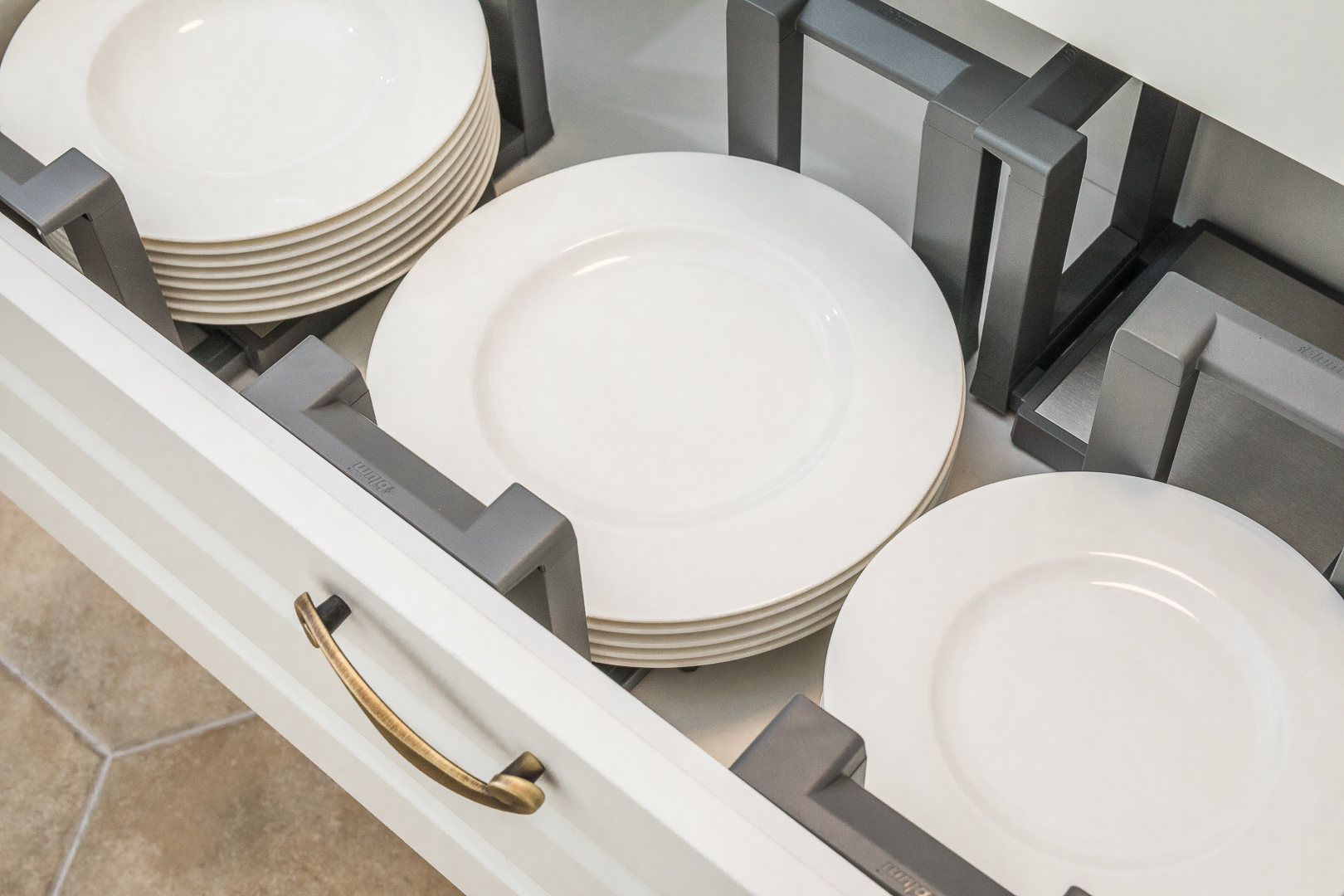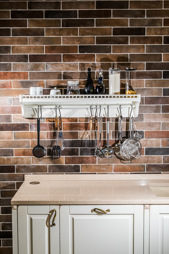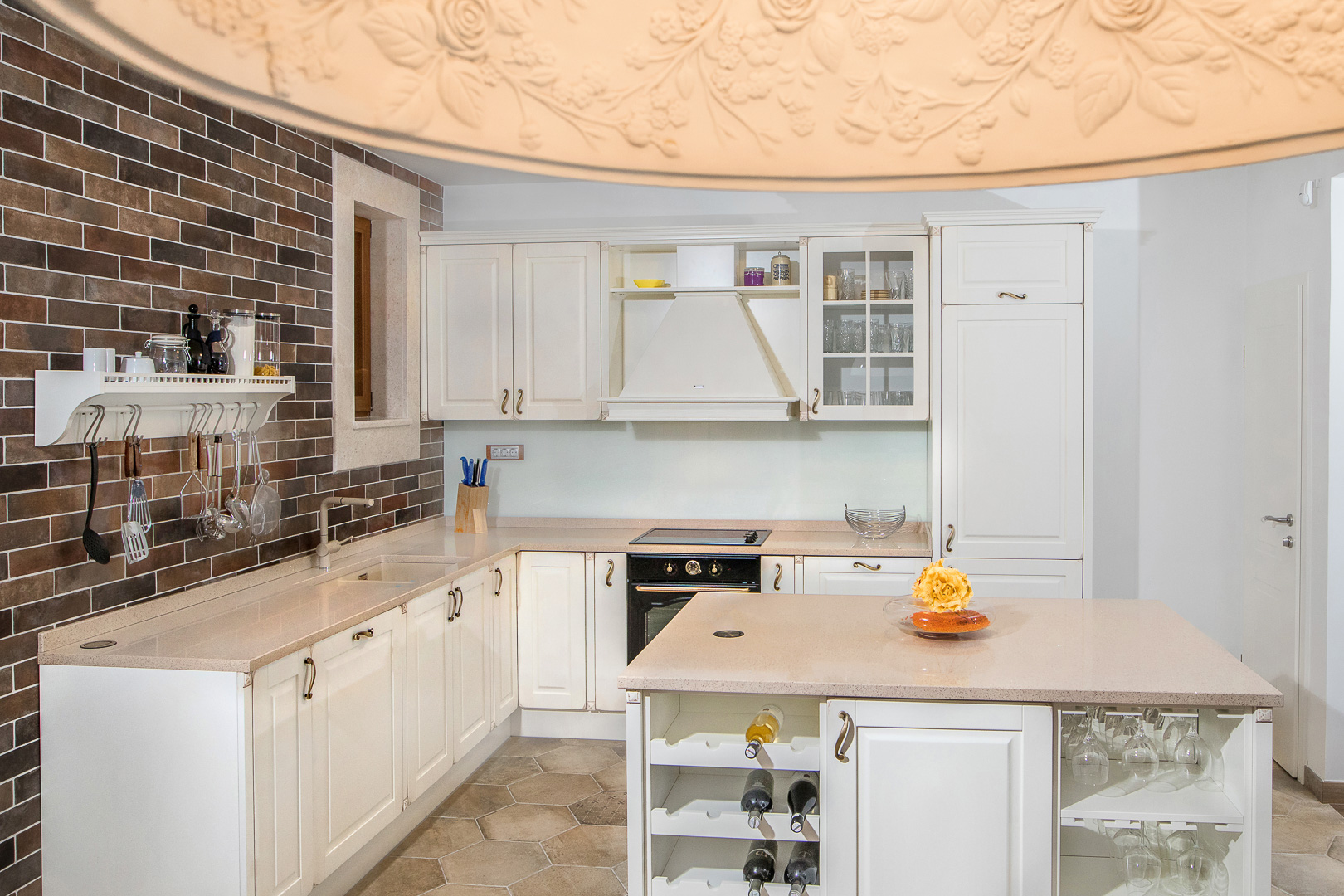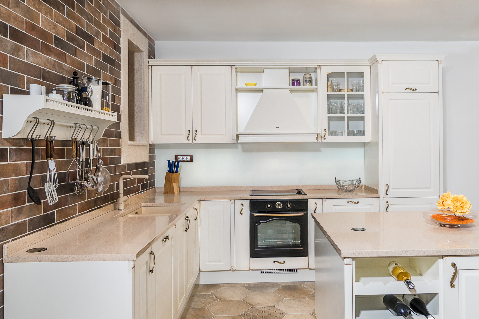Bezvremenska ljepota ove kuhinje u rustičnom stilu postignuta je prepoznatljivim ukladama na masiv frontama. Specifičnost izvedbe kod ove kuhinje su zakošeni tzv. smušani rubovi kojima je decentno dodana patina kako bi se postigao vintage izgled. U istom stilu birani su i kuhinjski aparati te ostala dodatna oprema i detalji. Kuhinja je obogaćena dodavanjem dekorativnih masivnih bokova te oblaganjem samostojeće nape, a ukrasne masiv krune na gornjim elementima i kamena radna ploha točka su na i.